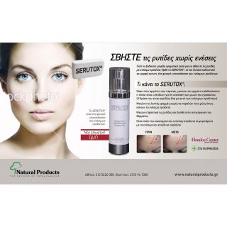 Η αποτελεσματικότητα του SERUTOX® οφείλεται στη δράση ενος νέου ενεργού μη-τοξικού αντιγηραντικού συστατικού, το εξαπεπτίδιο Αργιρελίνη το οποίο δρά στο βάθος των ρυτίδων καθώς και των μοναδικών βιοενεργών συστατικών που περιέχει όπως και το υαλουρονικό οξύ (ένας από τους δραστικότερους αντιγηραντικούς παράγοντες).