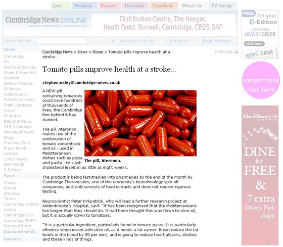 Εκατοντάδες επιστημονικές μελέτες, σχετικά με τη μεσογειακή διατροφή, έδειξαν πως η λυκοπένη , που βρίσκεται στη φλούδα της ώριμης ντομάτας, είναι η πλέον αντιοξειδωτική ουσία η οποία εάν απορροφηθεί σωστά από τον οργανισμό συμβάλει στην προστασία της υγείας της καρδιάς.Βρετανοί επιστήμονες ανακάλυψαν μια κάψουλα που περιέχει μια επεξεργασμένη μορφή λυκοπένης (ένωση πρωτεΐνης ορρού γάλακτος και γάλα σόγιας), ευκολότερα απορροφήσιμη από τον οργανισμό και αποτελεσματική στην πρόληψη καρδιακών νόσων και εγκεφαλικών επεισοδίων.Το ATERONON™ παρουσιάστηκε στη διεθνή συνάντηση της Βρετανικής Καρδιολογικής κοινότητας και παρασκευάζεται σε συνεργασία με τη Νestle